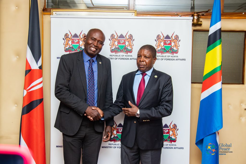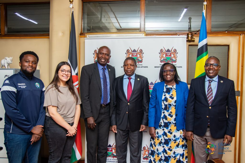 The Africa Regional Representative of Global Peace Foundation, Mr. Daniel Juma Omondi, accompanied by Irene Kizito of Global Peace Women, Savanna McWilliams from Pepperdine University, and Programs Associate Mr. Benjamin Kitonga, paid a courtesy visit to the Chief of Protocol, Amb. Josphat K. Maikara, at the Ministry of Foreign Affairs Headquarters. Amb. Maikara was joined by his Deputy, Mr. Samson Koech.